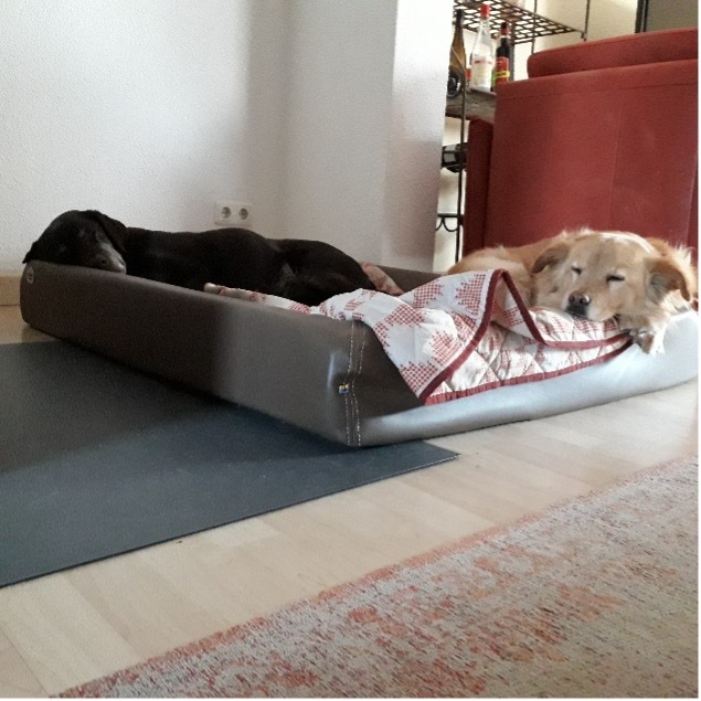 Es gab natürlich auch „Baustellen“, aber mehr in Sachen Gesundheit. Sie hatte, wie im Vermittlungsgespräch auch thematisiert eine Ohrenentzündung, die sehr langwierig war und erst durch eine komplette Futterumstellung in den Griff zu bekommen war. Denn trotz vieler Ohrentropen, -gels und einer Spülung unter Narkose wurde es nicht besser. Wochenlang hat sie nie durchgeschlafen (trotz starker Schmerzmittel) und vor Unruhe an allem genagt, was in ihrer Nähe war (auch Kabel in der Wohnung!). Die Hüfte ist natürlich auch dauerhaft geschädigt - lange Wanderrouten kann sie eher nicht gehen. Aber sie ist gut eingestellt und geht beim Gassi munter mit. Dies alles hat natürlich viele Tierartzbesuche erfordert, wir waren Stammgast dort.